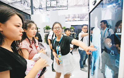 在上海2017年亞洲消費(fèi)電子展上,參觀者在體驗(yàn)一款可與電商平臺(tái)網(wǎng)絡(luò)連接實(shí)現(xiàn)試穿下單一體化的智能穿衣鏡。新華社記者方喆攝