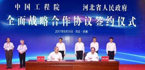 2017年8月18日上午,中國工程院與河北省人民政府在河北省承德市舉行了全面戰(zhàn)略合作簽約儀式。中國工程院黨組書記李曉紅、河北省省委副書記、省長許勤、中國工程院副院長劉旭、河北省人民政府副省長張古江、河北省人民政府副省長徐建培出席了會議。劉旭、徐建培代表院省雙方簽署了合作協(xié)議。河北省人民政府秘書長朱浩文主持了簽約儀式。