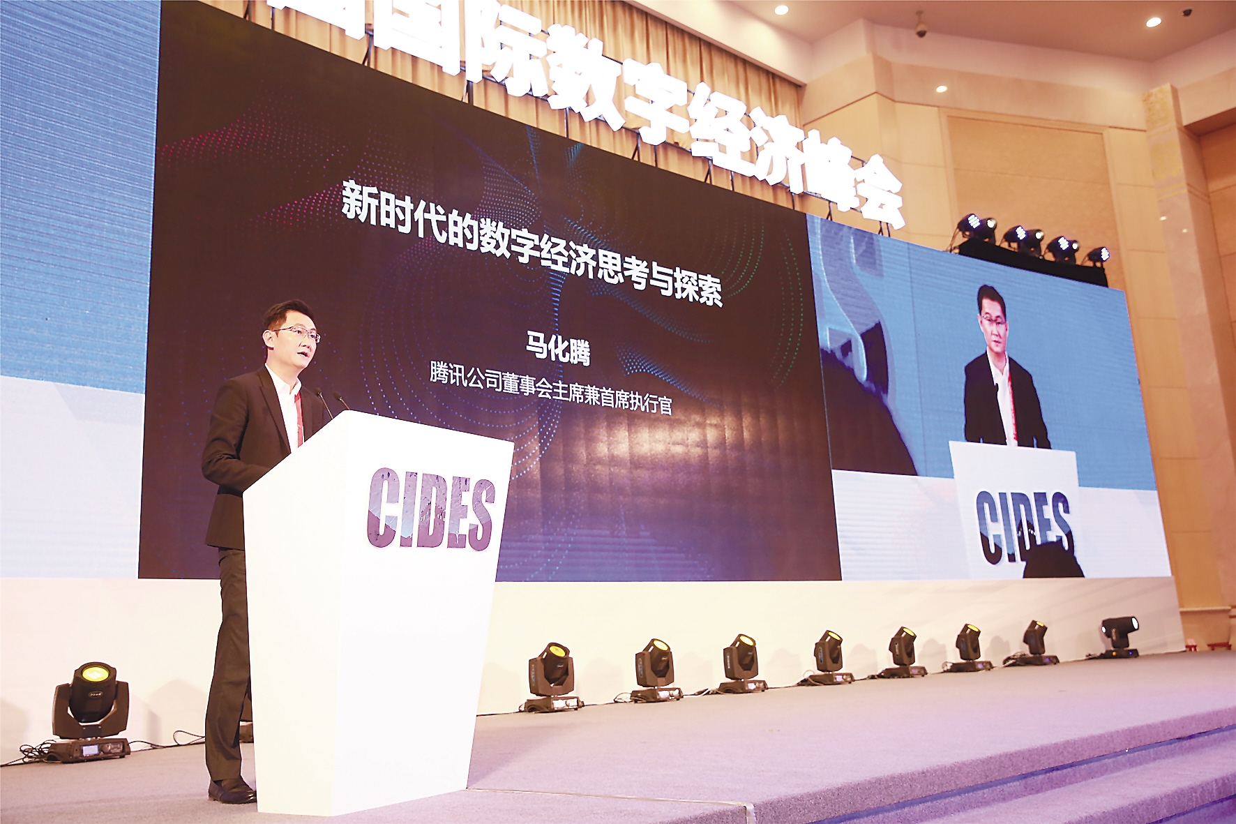騰訊公司董事局主席兼首席執行官馬化騰作主題演講。記者閆思宇攝