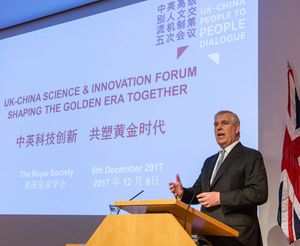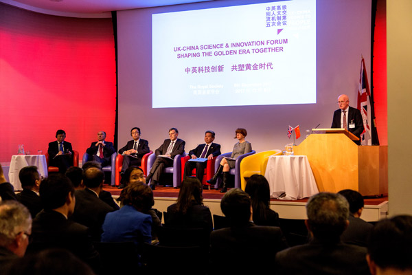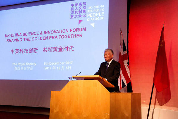 2017年12月6日,中國(guó)科學(xué)技術(shù)部與英國(guó)商業(yè)、能源和產(chǎn)業(yè)戰(zhàn)略部在英國(guó)皇家學(xué)會(huì)共同舉辦“中英科技創(chuàng)新合作:共塑黃金時(shí)代”論壇,該活動(dòng)是中英高級(jí)別人文交流機(jī)制第五次會(huì)議的重要活動(dòng)之一。國(guó)務(wù)院副總理劉延?xùn)|、科技部黨組書記、副部長(zhǎng)王志剛與英國(guó)約克公爵安德魯王子、英國(guó)大學(xué)、科學(xué)、研究與創(chuàng)新國(guó)務(wù)大臣喬·約翰遜(Jo Johnson)等出席論壇致辭并參觀了中英科技創(chuàng)新成果展。