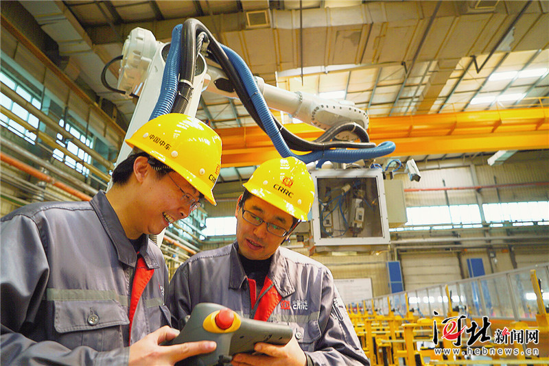 近日,中車唐山機車車輛有限公司鋁合金廠高級技師張雪松(右)和同事調(diào)試動車組鋁合金車體側(cè)墻焊縫自動打磨機器人。記者劉禹彤?dāng)z
