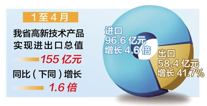 本報訊(記者邢杰冉通訊員楊寶麗)據石家莊海關統計,1至4月,我省高新技術產品實現進出口總值155億元,同比(下同)增長1.6倍。其中出口58.4億元,增長41.7%;進口96.6億元,增長4.6倍。